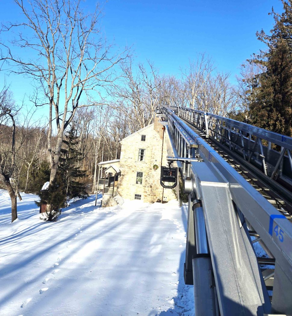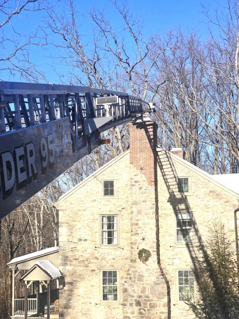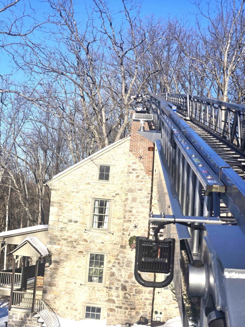 01/30/2026 – At 14:49 hours Ladder 95 was dispatched on the initial structure assignment to assist Oley Fire Company, Station 5, with a possible structure fire caller reported the house has an odor of plastic burning and the residence is filling up with smoke. Rescue 95 also made the response as an engine to cover an initial unit. Engine 5, under the command of Assistant 5, arrived first due and reported a haze of smoke in the residence. The report also was a very long snow covered driveway and all additional units to stage on the main roadway. Upon arrival of Ladder 95 the request was made to attempt for the ladder to enter the driveway to gain access to the roof of the residence. Command reported that the incident was a chimney fire. Ladder 95 navigated the long narrow driveway behind Engine 5 and upon arrival setup the main to access the chimney. Crews assisted in checking the chimney and it was determined that there was a blockage causing the smoke condition. Personnel assisted with removing enough of the clogged flue ashes and debris to assure the fire was extinguished. Command determined there was no longer fire nor smoke from the chimney and terminated operations. The company was released and available at 15:57 hours.