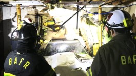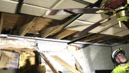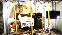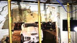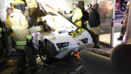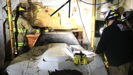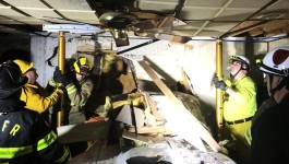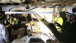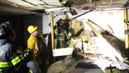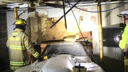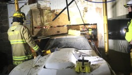 Upon evaluation it was determined that the second floor was compromised due to the amount of the first floor wall studs knocked out by the accident and this was the support wall for the second floor. It was also determined the first floor was a concrete slab with no basement. The Special Operations Assistant Chief and Captain developed a plan to construct a support around and over the vehicle using Paratech struts and aluminum waler to capture the second floor joists. Utilities were secured and a portion of the drop ceiling was removed to expose the rafters. Personnel then built the support system and installed next to and across the vehicle. The remaining damaged wall which was resting on the vehicle was removed and the exterior wall was cut around the vehicle to allow Berks-Mont Towing to safely remove the vehicle.