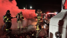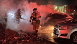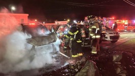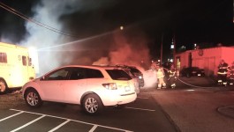 Company 95 was dispatched to Peach Street Alley behind Iezzi’s on Third for a vehicle on fire at 0020 hours. On arrival crews found a Hyundai SUV fully engulfed in flames parked next to other vehicles. Crews pulled a line and began extinguishing the fire and protecting the vehicles around the one on fire. Eastern Berks Regional Police are investigating the incident and working on identifying the owner of the vehicle as the occupant had fled the scene prior to arrival of emergency services. Boyertown Ambulance was on scene to assist BAF&R. Berks-Mont Towing impounded the vehicle for Eastern Berks Regional Police.