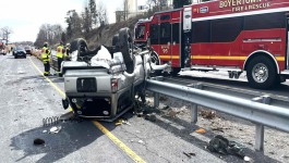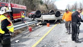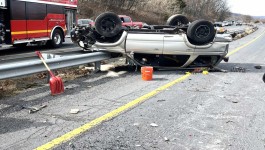 Company 95 was dispatched at 1500 hours for 1 vehicle overturned with injuries blocking the Northbound lane of Rt 100 about 1 mile south of the Montgomery Avenue interchange. Crews arrived and stabilized the vehicle and controlled leaking fluids. The driver was transported to a local hospital by Boyertown Ambulance. Fire Police from BAF&R, Eastern Berks Fire and Gilbertsville Fire & Rescue shut down the North bound lanes of Rt 100 at County Line Road and controlled South bound traffic past the scene. Crews assisted Berks Mont Towing with removal of the vehicle and clean up debris. Another vehicle was struck by this vehicle approximately 700 feet South of where this vehicle came to rest, that driver was not injured.