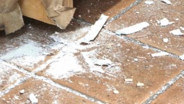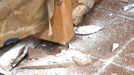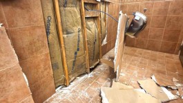 Upon entering the building the damage had occurred in a restroom and several of the framing studs were pushed off the wall base plate and the drywall and tile were also pushed in. Personnel began checking to assure the utilities were secure to the room due to electrical circuits being compromised. Personnel also check the second floor and condition of the damaged wall at the top plate where the studs attach.