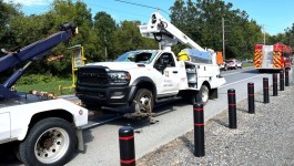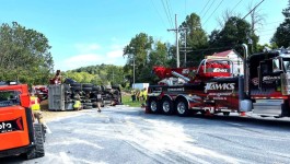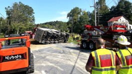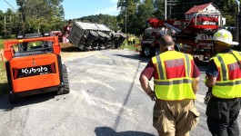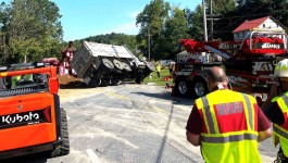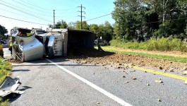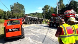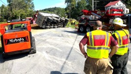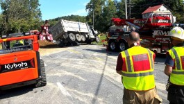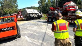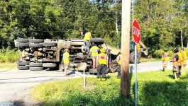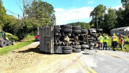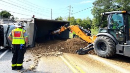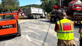 Company 95 was dispatched at 0913 hours for a crash involving two trucks both reported to be rolled over with the drivers trapped inside. The Colebrookdale Public Works Crew were on scene when BAF&R crews arrived and they brought equipment to the scene to assist with removal of the vehicles and cleaning up the highway. Boyertown Ambulance crews evaluated the drivers and both refused further medical treatment. Crews used Haz MAT booms and absorbent to control leaking fluids. The smaller Utility truck was up righted and removed by Berks-Mont Towing and the larger truck was up righted and removed by HAWK’S Towing. Rt 73 was shut down in that area for a few hours until crews could clean up the dirt that was dumped on the highway and shoulder of the roadway.